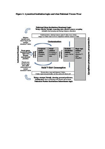 This article brings together theories of institutional logics and the exploration of the lives of tweens in Pakistan to understand how emerging consumption practices fit within Pakistani children’s daily lives, and how institutional complexity that includes the dominance of religion under Pakistani Islamization is negotiated to separate and maintain the differences between them. We identify resolutions to asymmetrical institutional complexity in the consumption of character T-shirts: spatial–temporal practices, visual practices, symbolic substitution practices and single logic practices. We contribute to an understanding of how consumption happens in an Eastern Muslim culture, and how multiple institutional logics shape the consumption practices of children, by articulating how halal consumption practices, far from being essentialist, or presented as market segmentation, form from negotiations and reflections at the boundaries where Islam and Market logics meet.