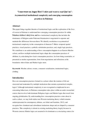Husain, S., Molesworth, M. and Grigore, G. (2019) 'I once wore an angry bird t-shirt and went to read Qur’an': asymmetrical institutional complexity and emerging consumption practices in Pakistan. Marketing Theory, 19 (3). pp. 367-390. ISSN 1741-301X doi: 10.1177/1470593118821717