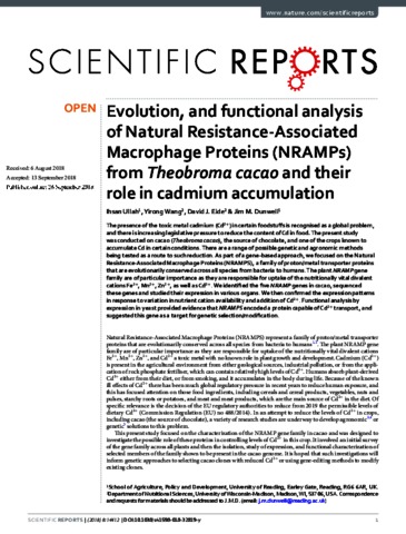 Ullah, I. orcid id iconORCID: https://orcid.org/0000-0002-9367-6741, Wang, Y., Eide, D. J. and Dunwell, J. M. orcid id iconORCID: https://orcid.org/0000-0003-2147-665X (2018) Evolution, and functional analysis of Natural Resistance-Associated Macrophage proteins (NRAMPs) from Theobroma cacao and their role in cadmium accumulation. Scientific Reports, 8. 14412. ISSN 2045-2322 doi: 10.1038/s41598-018-32819-y