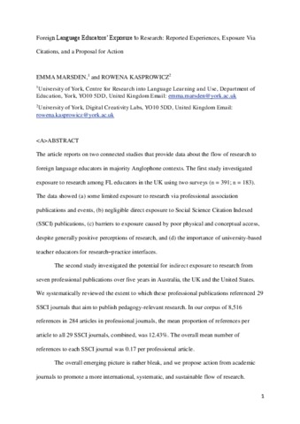 Foreign language educators’ exposure to research: reported experiences, exposure via citations, and a proposal for action.