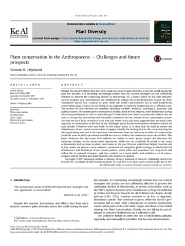 Heywood, V. H. (2017) Plant conservation in the Anthropocene - challenges and future prospects. Plant Diversity, 39 (6). pp. 314-330. ISSN 2468-2659 doi: 10.1016/j.pld.2017.10.004