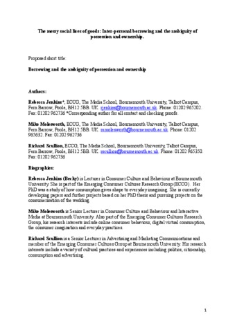 Jenkins, R., Molesworth, M. and Scullion, R. (2014) The messy social lives of objects: inter‐personal borrowing and the ambiguity of possession and ownership. Journal of Consumer Behaviour, 13 (2). pp. 131-139. ISSN 1479-1838 doi: 10.1002/cb.1469