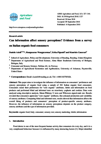 This paper aims to investigate the influence of information on consumers’ preferences and sensory perceptions of organic food using a sample of 301 Italian organic food consumers. Consumers stated their preferences for “core organic” attributes, labels and information on food products and performed blind and informed tests on strawberry yoghurts and cookies. Data were analysed using descriptive analysis, Mann-Whitney U tests and Wilcoxon signed-rank test. Results revealed that consumers appreciate “core organic” attributes, like artisanal production and variability of sensory attributes. Comparing blind and informed tests, results showed that information affects the overall liking of products and consumers’ perception of product-specific sensory attributes. However, the influence of information on sensory perceptions depends on the product category, sensory attributes and the type of information provided.