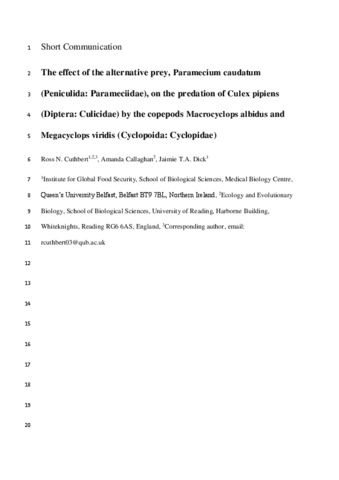 The effect of the alternative prey, Paramecium caudatum (Peniculida: Parameciidae), on the predation of Culex pipiens (Diptera: Culicidae) by the copepods Macrocyclops albidus and Megacyclops viridis (Cyclopoida: Cyclopidae).