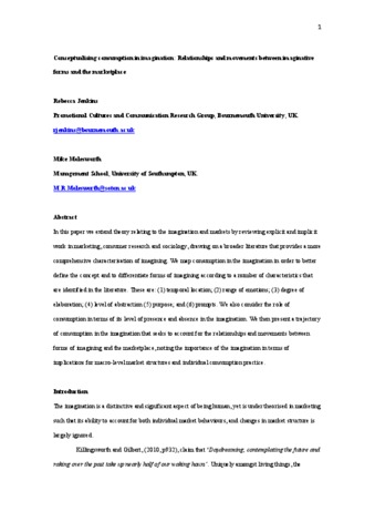 Jenkins, R. and Molesworth, M. (2018) Conceptualizing consumption in the imagination: relationships and movements between imaginative forms and the marketplace. Marketing Theory, 18 (3). pp. 327-347. ISSN 1741-301X doi: 10.1177/1470593117740753