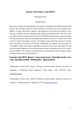 This study examines the relationship between sponsor ownership and firm performance proxied by firm value, operating cash flow, and dividend policy with Asian real estate investment trusts (REITs) in Japan, Hong Kong, Malaysia, and Singapore for the period from 2002 to 2012, focusing on both the incentive alignment effect and the entrenchment effect. Our study sheds new light on effective corporate governance for Asian REITs that are prone to agency problems. Such agency problems arise from the inequitable distribution of power to sponsors that results from the external management structure. The findings suggest that larger sponsor ownership aligns the interests of sponsors and minority shareholders and enhances the performance of Asian REITs, while such an effect diminishes as sponsors become more entrenched. We find that the incentive alignment effect and entrenchment effect are primarily driven by developer-sponsored REITs. Also evident is that the presence of institutional investors mitigates agency problems and increases firm performance.