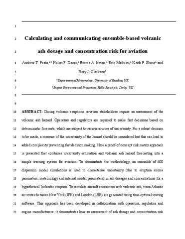 Prata, A. T., Dacre, H. F. orcid id iconORCID: https://orcid.org/0000-0003-4328-9126, Irvine, E. A., Mathieu, E., Shine, K. P. orcid id iconORCID: https://orcid.org/0000-0003-2672-9978 and Clarkson, R. J. (2019) Calculating and communicating ensemble-based volcanic ash dosage and concentration risk for aviation. Meteorological Applications, 26 (2). pp. 253-266. ISSN 1469-8080 doi: 10.1002/met.1759