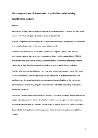 | Uncontrolled Keywords | Psychology; Research as therapy; Video diaries; Breast Feeding; Counseling; Talking therapy |