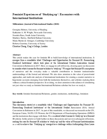 This article makes the case for feminist IR to build knowledge of international institutions. It emerges from a roundtable titled ‘Challenges and Opportunities for Feminist IR: Researching Gendered Institutions’ which took place at the International Studies Association Annual Convention in Baltimore in 2017. Here, we engage in self-reflexivity, drawing upon our discussion to consider what it means for feminist scholars to ‘study up’. We argue that feminist IR conceptions of narratives and the everyday make a valuable contribution to feminist institutionalist understandings of the formal and informal. We also draw attention to the value of postcolonial approaches, and multi-site analysis of international institutions for creating a counter-narrative to hegemonic accounts emerging from both the institutions themselves, and scholars studying them without a critical feminist perspective. In so doing, we draw attention to the salience of considering not just what we study as feminist International Relations scholars but how we study it.