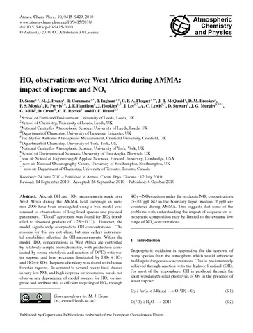 Stone, D., Evans, M.J., Commane, R., Ingham, T., Floquet, C.F.A., McQuaid, J.B., Brooks, D., Monks, P.S., Purvis, R.M., Hamilton, J., Hopkins, J., Lee, J., Lewis, A.C., Stewart, D., Murphy, J.G., Mills, G., Oram, D., Reeves, C.E. and Heard, D. (2010) HOx observations over West Africa during AMMA: impact of isoprene and NOx. Atmospheric Chemistry and Physics, 10 (19). pp. 9415-9429. ISSN 1680-7316 doi: 10.5194/acp-10-9415-2010