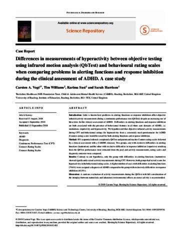 Vogt, C., Williams, T. orcid id iconORCID: https://orcid.org/0000-0003-0072-3316, Susi, K. and Harrison, S. (2018) Differences in measurements of hyperactivity between objective testing using infrared motion analysis (QbTest) and behavioural rating scales when comparing problems in alerting functions and response inhibition during the clinical assessment of ADHD. Psychological disorders and research, 1 (2). pp. 3-6. doi: 10.31487/j.PDR.2018.02.002