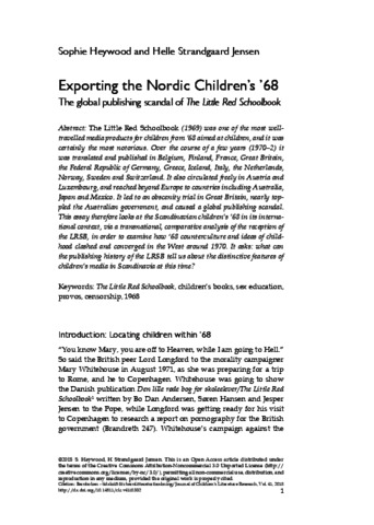 Heywood, S. orcid id iconORCID: https://orcid.org/0000-0001-6641-2065 and Strandgaard Jensen, H. (2018) Exporting the Nordic children’s ’68: the global publishing scandal of The Little Red Schoolbook. Barnboken Journal of Children's Literature Research, 41. ISSN 2000-4389 doi: 10.14811/clr.v41i0.332