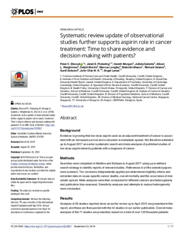 Elwood, P. C., Pickering, J. E., Morgan, G., Galante, J., Weightman, A. L., Morris, D., Longley, M., Mason, M., Adams, R., Dolwani, S., Chia W. K., J. and Lanas, A. (2018) Systematic review update of observational studies further supports aspirin role in cancer treatment: time to share evidence and decision-making with patients? PLOS ONE, 13 (9). e0203957. ISSN 1932-6203 doi: 10.1371/journal.pone.0203957