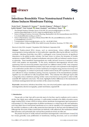 Doyle, N., Neuman, B. W., Simpson, J., Hawes, P. C., Mantell, J., Verkade, P., Alrashedi, H. and Maier, H. J. (2018) Infectious bronchitis virus nonstructural protein 4 alone induces membrane pairing. Viruses, 10 (9). 477. ISSN 1999-4915 doi: 10.3390/v10090477
