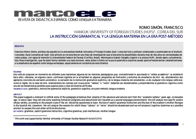 Romo Simon, F. (2015) La instrucción gramatical y la lengua materna en la era post-método. MarcoELE, 2015 (21). ISSN 1885-2211