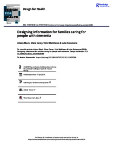 Black, A., Carey, C., Matthews, V. and Solomons, L. (2019) Designing information for families caring for people with dementia. Design for Health, 3 (2). pp. 199-219. ISSN 2473-5132 doi: 10.1080/24735132.2019.1629766