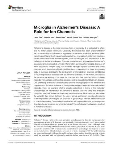 Thei, L., Imm, J., Kaisis, E., Dallas, M. L. orcid id iconORCID: https://orcid.org/0000-0002-5190-0522 and Dallas, T. L. (2018) Microglia in Alzheimer's disease: a role for ion channels. Frontiers in Neuroscience, 12. 676. ISSN 1662-453X doi: 10.3389/fnins.2018.00676