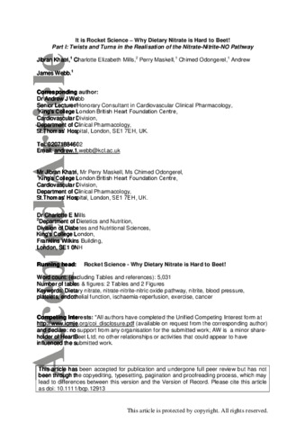Khatri, J., Mills, C. E. orcid id iconORCID: https://orcid.org/0000-0002-8313-3700, Maskell, P., Odongerel, C. and Webb, A. J. (2017) It is rocket science - why dietary nitrate is hard to ‘beet’! Part I: twists and turns in the realization of the nitrate-nitrite-NO pathway. British Journal of Clinical Pharmacology, 83 (1). pp. 129-139. ISSN 0306-5251 doi: 10.1111/bcp.12913