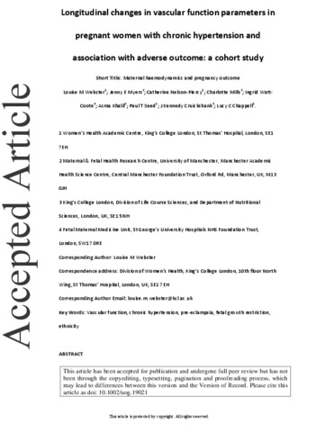 Longitudinal changes in vascular function parameters in pregnant women with chronic hypertension and association with adverse outcome: a cohort study.