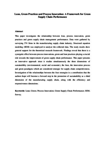 This paper investigates the relationship between lean, process innovation, green practices and green supply chain management performance. Data were gathered by surveying 374 firms in the manufacturing supply chain industry. Structural equation modeling (SEM) was employed to analyze the collected data. The study results show general support for the theoretical research framework. Findings reveal that there is a synergetic effect between process innovations, green and lean practices playing a crucial role towards the improvement of green supply chain performance. This paper presents an innovative approach since it studies simultaneously the three dimensions of sustainability (environmental, social and economic), the lean, the innovation process and green paradigms which are considered strategic for supply chain competitiveness. Investigation of the relationships between the four strategies is a contribution that the authors hope will become a forward step in the promotion of sustainability as a third dimension of the manufacturing supply chain, along with the efficiency and responsiveness dimensions.