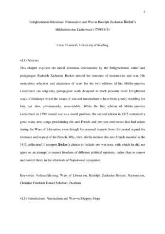 Enlightenment dilemmas: nationalism and war in Rudolph Zacharias Becker’s Mildheimisches Liederbuch (1799/1815).
