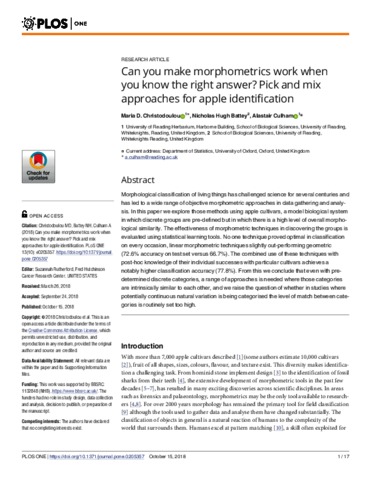 Christodoulou, M. D., Battey, N. H. and Culham, A. orcid id iconORCID: https://orcid.org/0000-0002-7440-0133 (2018) Can you make morphometrics work when you know the right answer? Pick and mix approaches for apple identification. PLoS ONE, 13 (10). e0205357. ISSN 1932-6203 doi: 10.1371/journal.pone.0205357