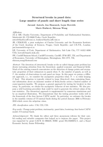 Antoch, J., Hanousek, J., Horváth, L., Hušková, M. and Wang, S. orcid id iconORCID: https://orcid.org/0000-0003-2113-5521 (2019) Structural breaks in panel data: large number of panels and short length time series. Econometric Reviews. ISSN 1532-4168 doi: 10.1080/07474938.2018.1454378