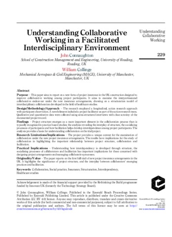 Purpose: This paper reports on the trial of a new form of project insurance in UK construction designed to improve collaborative working among project participants by enhancing their joint responsibility for project outcomes. Its purpose is to examine the interprofessional collaborative endeavour under these new insurance arrangements, drawing on a structuration model of interdisciplinary collaboration developed in the field of healthcare studies. Design/Methodology/Approach: The research involved a longitudinal, action research approach with participant observation over the period of the trial project. A novel element included a project facilitator as part of the action research team. In addition, qualitative and quantitative data were collected using semi-structured interviews with project participants and close scrutiny of the documented project record. Findings: The study findings are in line with other social practice-based studies of collaboration in construction in which collaborators socialise the collaborative endeavour, developing their interpretation of what collaboration means and their own modus operandi. However, project structure emerges as a more important element in the collaboration process than is typically recognised in practice-based studies. More significantly, the analysis reveals that it is the interplay of structure, the socialising processes of the participants, and facilitation that helps develop interdependence among project participants and provides a basis for understanding collaboration on the trial project. Research limitations/implications: The case study project provides a unique context for the examination of collaboration under the new project insurance arrangements. But the results have implications for the study of collaboration in highlighting the important relationship between project structure, collaboration and facilitation. Practical implications: Understanding the importance of how interdependency is developed through structure, the socialising processes of collaborators, and facilitation has important implications for those concerned with designing project arrangements and managing collaborative processes. Originality/value: The trial project is the first full trial of the new project insurance arrangements in the UK, and provides a unique context for the study of collaboration. By highlighting the significance of project structure, and the interplay between structure, the collaborators’ emerging practices and facilitation, the paper departs from other work in this area to suggest fruitful avenues for further enquiry, and for practice.