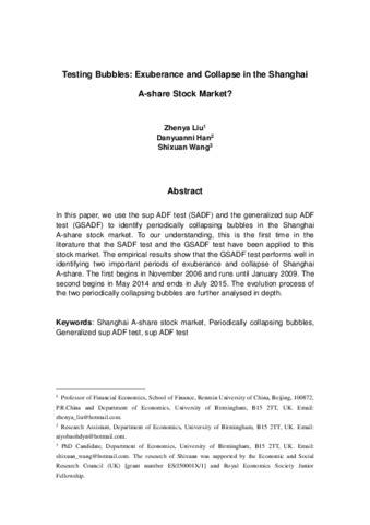 Liu, Z., Han, D. and Wang, S. orcid id iconORCID: https://orcid.org/0000-0003-2113-5521 (2016) Testing bubbles: exuberance and collapse in the Shanghai a-share stock market. In: Song, L., Garnaut, R., Cai, F. and Johnston, L. (eds.) China's New Sources of Economic Growth. ANU Press, pp. 247-270. ISBN 9781760460358 doi: 10.22459/CNSEG.07.2016.11