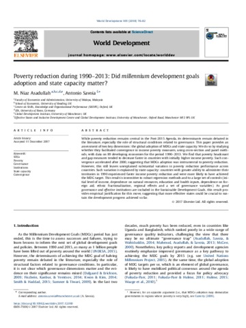 Asadullah, M. N. and Savoia, A. (2018) Poverty reduction during 1990-2013: did millennium development goals adoption and state capacity matter? World Development, 105. pp. 70-82. ISSN 0305-750X doi: 10.1016/j.worlddev.2017.12.010