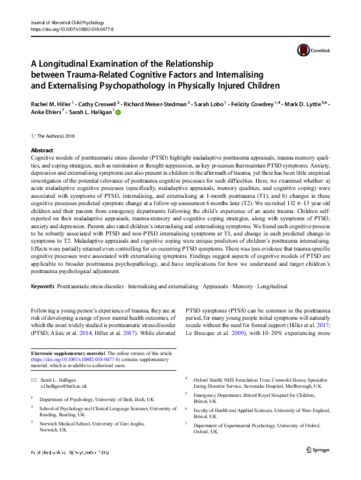 Hiller, R. M., Creswell, C., Meiser-Stedman, R., Lobo, S., Chowdrey, F., Lyttle, M. D., Ehlers, A. and Halligan, S. L. (2019) A longitudinal examination of the relationship between trauma-related cognitive factors and internalising and externalising psychopathology in physically injured children. Journal of Abnormal Child Psychology, 47 (4). pp. 683-693. ISSN 0091-0627 doi: 10.1007/s10802-018-0477-8