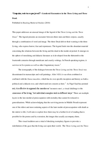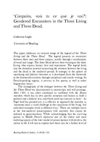 Leglu, C. (2018) ‘Conpains, vois tu ce que je voi?’: gendered encounters in the Three Living and Three Dead. Reading Medieval Studies, XLIV. pp. 1-20. ISSN 0950-3129 (ISBN 9780704915824)