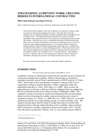 Ulutas Duman, D. and Green, S. D. orcid id iconORCID: https://orcid.org/0000-0003-1660-5592 (2018) Strategising as identity work: creating heroes in international contracting. In: 34th Annual ARCOM conference, 3-5 September, Queens University Belfast.
