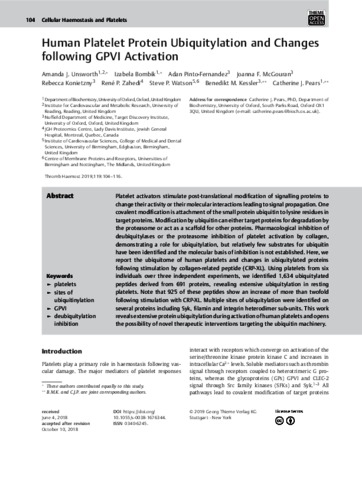 Unsworth, A. J., Bombik, I., Pinto-Fernandez, A., McGouran, J. F., Konietzny, R., Zahedi, R. P., Watson, S. P., Kessler, B. M. and Pears, C. J. (2019) Human platelet protein ubiquitylation and changes following GPVI activation. Thrombosis and Haemostasis, 119 (1). pp. 104-116. ISSN 0340-6245 doi: 10.1055/s-0038-1676344