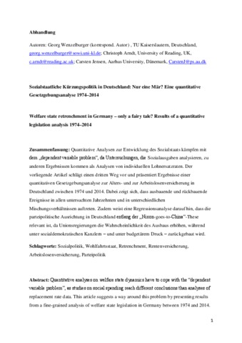 Wenzelburger, G., Arndt, C. and Jensen, C. (2018) Sozialstaatliche Kürzungspolitik in Deutschland: Nur eine Mär? Eine quantitative Gesetzgebungsanalyse 1974–2014. Politische Vierteljahresschrift, 59 (4). pp. 681-712. ISSN 1862-2860 doi: 10.1007/s11615-018-0109-5