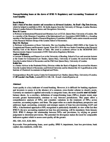 Asset quality is a key indicator of sound banking. However, it is difficult for banking regulators and investors to assess it in the absence of a common, cross-border scheme to classify assets. Currently no standard is applied universally to categorise loans, the most sizeable asset on banks’ balance sheets. As a corollary, definitions of nonperforming loans (NPLs), despite recent steps towards greater harmonisation, continue to vary between jurisdictions. This paper offers a comprehensive analysis of NPLs and considers variations in the treatment of NPLs across countries, accounting regimes, and firms. The paper relies on a multi-disciplinary perspective and addresses legal, accounting, economic and strategic aspects of loan loss provisioning (LLP) and NPLs. A harmonised approach to NPL recognition is particularly desirable, in view of the fact that IFRS 9, the new accounting standard on loan loss provisioning, will be mandatory from January 2018. IFRS 9 changes the relationship between NPLs and provisions, by relying on greater judgement to determine provisions. The potential for divergence makes the need for comparable indicators against which to assess asset quality all the greater.