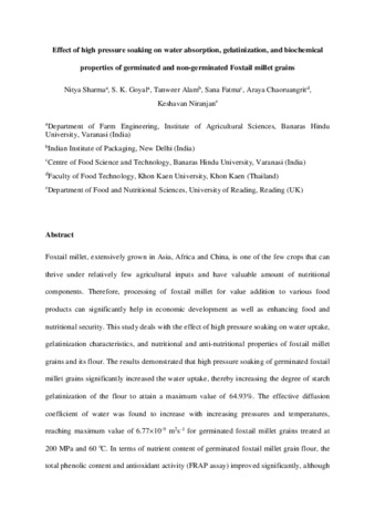 Foxtail millet, extensively grown in Asia, Africa and China, is one of the few crops that can thrive under relatively few agricultural inputs and have valuable amount of nutritional components. Therefore, processing of foxtail millet for value addition to various food products can significantly help in economic development as well as enhancing food and nutritional security. This study deals with the effect of high pressure soaking on water uptake, gelatinization characteristics, and nutritional and anti-nutritional properties of foxtail millet grains and its flour. The results demonstrated that high pressure soaking of germinated foxtail millet grains significantly increased the water uptake, thereby increasing the degree of starch gelatinization of the flour to attain a maximum value of 64.93%. The effective diffusion coefficient of water was found to increase with increasing pressures and temperatures, reaching maximum value of 6.77×10-9 m2s-1 for germinated foxtail millet grains treated at 200 MPa and 60 oC. In terms of nutrient content of germinated foxtail millet grain flour, the total phenolic content and antioxidant activity (FRAP assay) improved significantly, although the protein content did not vary significantly. Further, the levels of anti-nutrients (phytic acid and tannin) decreased with high pressure soaking, which conclusively establishes that the quality of foxtail millet grains and its flour can be improved by using high pressure soaking.