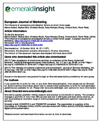 Hubert, M., Blut, M., Brock, C., Zhang, R. W., Koch, V. and Riedl, R. (2019) The influence of acceptance and adoption drivers on smart home usage. European Journal of Marketing, 53 (6). pp. 1073-1098. ISSN 0309-0566 doi: 10.1108/EJM-12-2016-0794