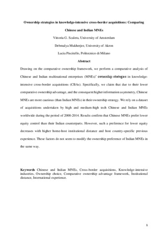 Drawing on the comparative ownership framework, we perform a comparative analysis of Chinese and Indian multinational enterprises (MNEs)’ ownership strategies in knowledge-intensive cross-border acquisitions (CBAs). Specifically, we claim that due to their lower comparative ownership advantage, and the consequent higher information asymmetry, Chinese MNEs are more cautious (than Indian MNEs) in their ownership strategy. We rely on a dataset of acquisitions undertaken by high and medium-high tech Chinese and Indian MNEs worldwide during the period of 2000-2014. Results confirm that Chinese MNEs prefer lower equity control than their Indian counterparts. However, such a preference for lower equity decreases with higher home-host institutional distance and host country-specific previous experience. These factors do not seem to modify the ownership preference of Indian MNEs in the same way.