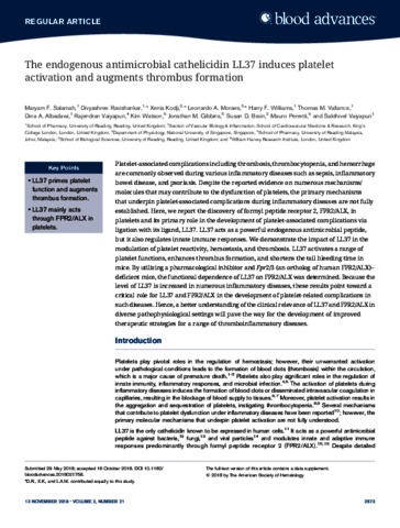 The endogenous antimicrobial cathelicidin LL37 induces platelet activation and augments thrombus formation.