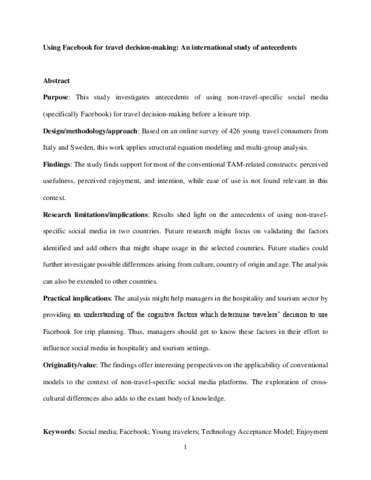 Purpose: This study investigates antecedents of using non-travel-specific social media (specifically Facebook) for travel decision-making before a leisure trip. Design/methodology/approach: Based on an online survey of 426 young travel consumers from Italy and Sweden, this work applies structural equation modeling and multi-group analysis. Findings: The study finds support for most of the conventional TAM-related constructs: perceived usefulness, perceived enjoyment, and intention, while ease of use is not found relevant in this context. Research limitations/implications: Results shed light on the antecedents of using non-travel-specific social media in two countries. Future research might focus on validating the factors identified and add others that might shape usage in the selected countries. Future studies could further investigate possible differences arising from culture, country of origin and age. The analysis can also be extended to other countries. Practical implications: The analysis might help managers in the hospitality and tourism sector by providing an understanding of the cognitive factors which determine travelers’ decision to use Facebook for trip planning. Thus, managers should get to know these factors in their effort to influence social media in hospitality and tourism settings. Originality/value: The findings offer interesting perspectives on the applicability of conventional models to the context of non-travel-specific social media platforms. The exploration of cross-cultural differences also adds to the extant body of knowledge.
