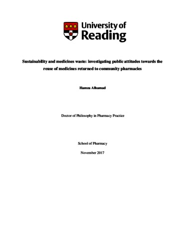 Alhamad, H. (2018) Sustainability and medicines waste: investigating public attitudes towards the reuse of medicines returned to community pharmacies. PhD thesis, University of Reading. doi: 10.48683/1926.00079994