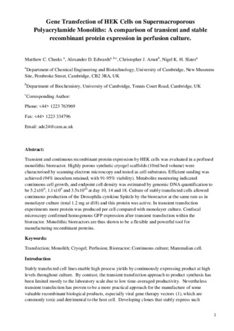 Cheeks, M. C., Edwards, A. D. orcid id iconORCID: https://orcid.org/0000-0003-2369-989X, Arnot, C. J. and Slater, N. K.H. (2009) Gene transfection of HEK cells on supermacroporous polyacrylamide monoliths: a comparison of transient and stable recombinant protein expression in perfusion culture. New Biotechnology, 26 (6). pp. 289-299. ISSN 1871-6784 doi: 10.1016/j.nbt.2009.08.006