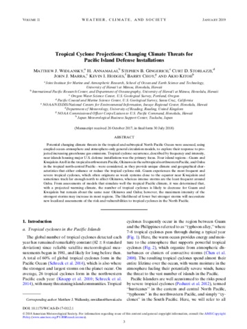Widlansky, M. J., Annamalai, H., Gingerich, S. B., Storlazzi, C. D., Marra, J. J., Hodges, K. I. orcid id iconORCID: https://orcid.org/0000-0003-0894-229X, Choy, B. and Kitoh, A. (2019) Tropical cyclone projections: changing climate threats for Pacific island defense installations. Weather, Climate, and Society, 11 (1). pp. 3-15. ISSN 1948-8327 doi: 10.1175/WCAS-D-17-0112.1