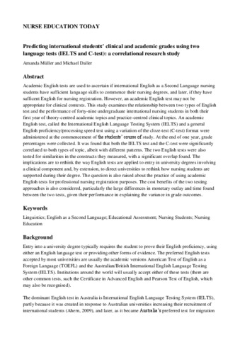 Daller, M. (2019) Predicting international students' clinical and academic grades using two language tests (IELTS and C-test): a correlational research study. Nurse Education Today, 72. pp. 6-11. ISSN 0260-6917 doi: 10.1016/j.nedt.2018.10.007