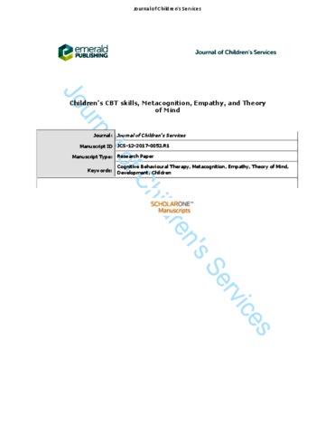Jones, J., Souchay, C., Moulin, C., Reynolds, S. and Adlam, A.-L. (2019) Children's CBT skills, metacognition, empathy, and theory of mind. Journal of Children's Services, 14 (1). pp. 16-26. ISSN 1746-6660 doi: 10.1108/JCS-12-2017-0052