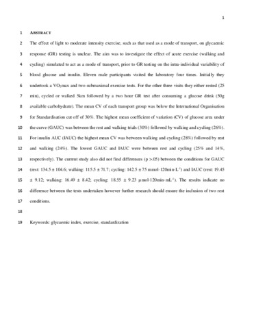 The effect of light- to moderate-intensity exercise, such as that used as a mode of transport, on glycemic response testing is unclear. The aim was to investigate the effect of acute exercise (walking and cycling), simulated to act as a mode of transport, prior to glycemic response testing on the intraindividual variability of blood glucose and insulin. A total of 11 male participants visited the laboratory four times. Initially, they undertook a maximum oxygen uptake and two submaximal exercise tests. For the other three visits, they either rested (25 min), cycled, or walked 5 km followed by a 2-hr glycemic response test after consuming a glucose drink (50 g of available carbohydrate). The mean coefficient of variation of each transport group was below the International Organization for Standardization cutoff of 30%. The highest mean coefficient of variation of glucose area under the curve (AUC) was between the rest and the walking trials (30%) followed by walking and cycling (26%). For insulin AUC, the highest mean coefficient of variation was between walking and cycling (28%) followed by rest and walking (24%). The lowest glucose AUC and insulin AUC were between rest and cycling (25% and 14%, respectively). This study did not find differences (p > .05) between the conditions for glucose AUC (at 120 min, rest: 134.5 +/- 104.6 mmol/L; walking: 115.5 +/- 71.7 mmol/L; and cycling: 142.5 +/- 75 mmol/L) and insulin AUC (at 120 min, rest: 19.45 +/- 9.12 mumol/ml; walking: 16.49 +/- 8.42 mumol/ml; and cycling: 18.55 +/- 9.23 mumol/ml). The results indicate no difference between the tests undertaken; however, further research should ensure the inclusion of two rest conditions.