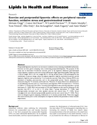 Clegg, M., McClean, C., Davison, W. G., Murphy, H. M., Trinick, T., Duly, E., McLaughlin, J., Fogarty, M. and Shafat, A. (2007) Exercise and postprandial lipaemia: effects on peripheral vascular function, oxidative stress and gastrointestinal transit. Lipids in Health and Disease, 6 (1). p. 30. ISSN 1476-511X doi: 10.1186/1476-511X-6-30