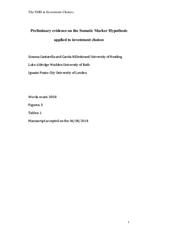Cantarella, S., Hillenbrand, C. orcid id iconORCID: https://orcid.org/0000-0002-2929-5098, Aldridge-Waddon, L. and Puzzo, I. (2018) Preliminary evidence on the Somatic Marker Hypothesis applied to investment choices. Journal of Neuroscience, Psychology, and Economics, 11 (4). pp. 228-238. ISSN 1937-321X doi: 10.1037/npe0000097