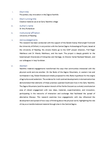 Neolithic material engagements transformed the ways in which communities interacted with the physical world and one another. Based on evidence from the flanks of the Zagros Mountains, in western Iran and north‐eastern Iraq, Robert Braidwood initially proposed his ‘Hilly Flanks’ hypothesis for the origins of agriculture and sedentism. The evidence for multi‐centred developments in domestication has demonstrated that elements of these practices spanned south‐west Asia in the Early Neolithic. The Zagros Mountains (and the eastern branch of the Fertile Crescent as a whole) constituted an area of vibrant engagement with new ideas, materials, experimentation and innovation, participating in the networks of interaction and exchange that facilitated the spread of alternative lifeways. This research examines how engagements with clay influenced the development and spread of new ways of thinking about the physical world, highlighting the role of clay as a transformational material through sites in the Central Zagros.